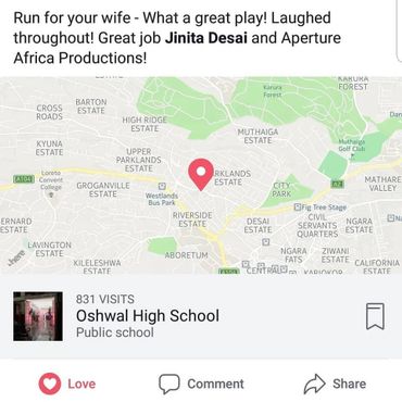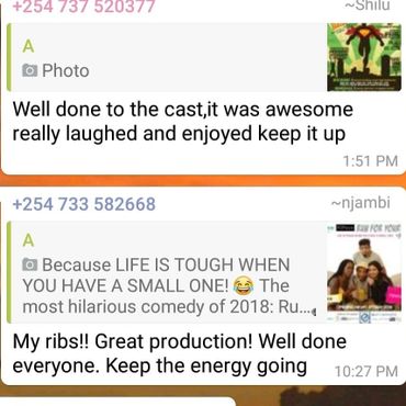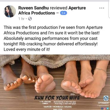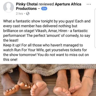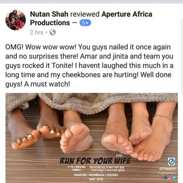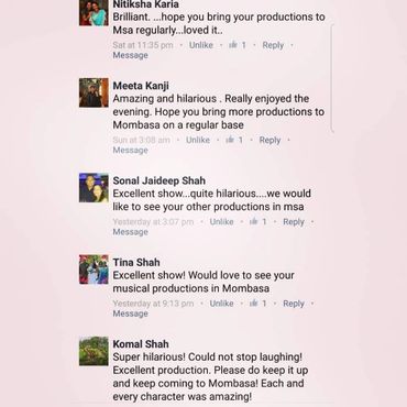 "Being part of theatre for almost 12 years, this production brought new energy for a different style of comedy. To direct and dramatize each personality on stage was an exhilarating and incredible experience and what you saw was one of the finest set of talent that East Africa has to offer!