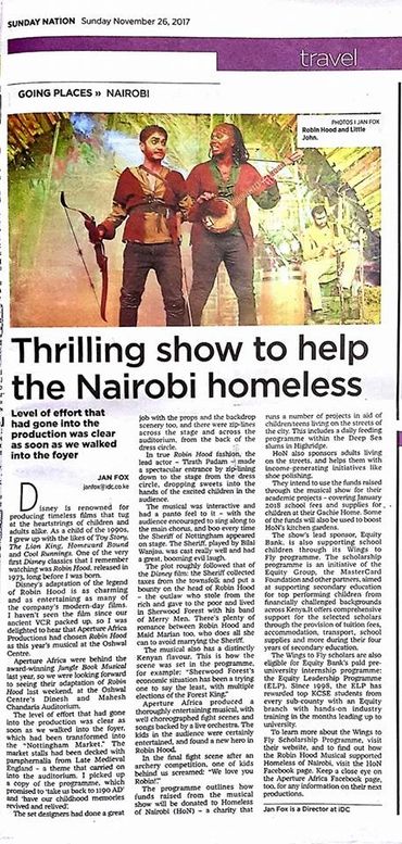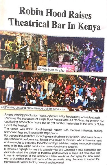 Our hero who steals from the rich and gives to the poor, and his gang of outlaws - brought back all the childhood memories. Ziplines on stage and over the audience, some fine archery skills, a live human spinning target and lots of audience assistance finally brought the Sheriff of Nottingham (or was it Kiambu?) to justice.